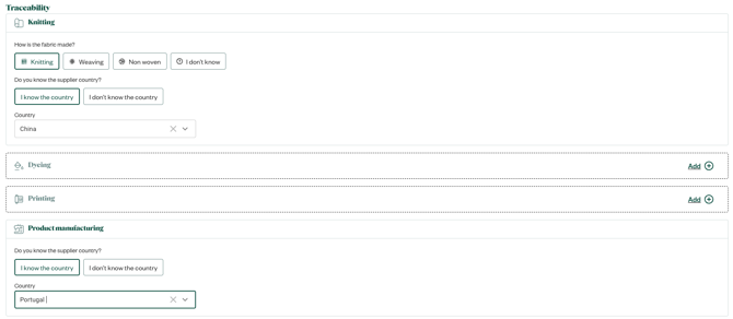 Formulários simplificados: Estes formulários são mais fáceis de preencher, mas menos detalhados do que os padrão. Eles exigem apenas que você declare os países onde ocorreram as principais etapas de transformação. São utilizados em projetos cujo objetivo é apenas ajudar as marcas de moda a cumprirem a lei francesa AGEC.